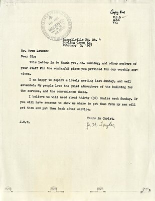 Letter from J.H. Taylor to Owen Lawson thanking WKU for allowing the congregation to use a Diddle Arena for services pending total evacuation of Jonesville area residents.