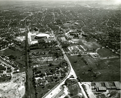Aerial view showing construction of Diddle Arena and remains of Jonesville.