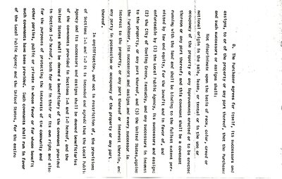 Continued discussion of covenants related to redevelopment of the property and anti-discrimination clause.